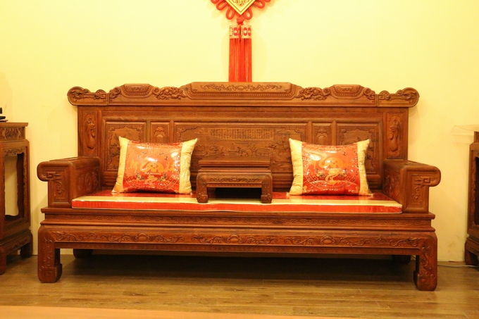該款沙發整體之表現顯得極為嚴密厚實,無一處鏤空之雕飾,在最上端背板處的中間部分為留有一些花紋之邊幅加以修飾,顯得極為浮美雅觀。而在其左右兩側則另雕繪有“麒麟戲珠”與“雛鳥朝鳳”兩處紋飾圖案:“麒麟戲珠”紋飾設計地較為特別,如草龍紋一般,除頭部精細雕刻外,其余四肢與形體均簡略化,身體部位采用一銜邊條帶狀的紋飾相串于圓珠內,頗顯靈動神韻;而“雛鳥朝鳳”的圖案則是在背板最上部的左右兩端,末端是饒有一圓弧之設計為修飾收尾,顯得極為婉轉柔和圓潤。紋飾的圖案為一只可愛的雛鳥深情脈脈含情注視著前方鳥鳳的場景,顯得實為溫馨。鳳凰處之設計處理地也與前面麒麟一同:頭部細化,其余簡略帶過,鳳凰處眼眸之雕飾顯得極為醒目,神情表現形態逼真,層次感和手觸感亦十分明瀝彰顯,而經燙蠟處理的表面緬花材質表現地也更為細膩淡雅,極盡奢華。